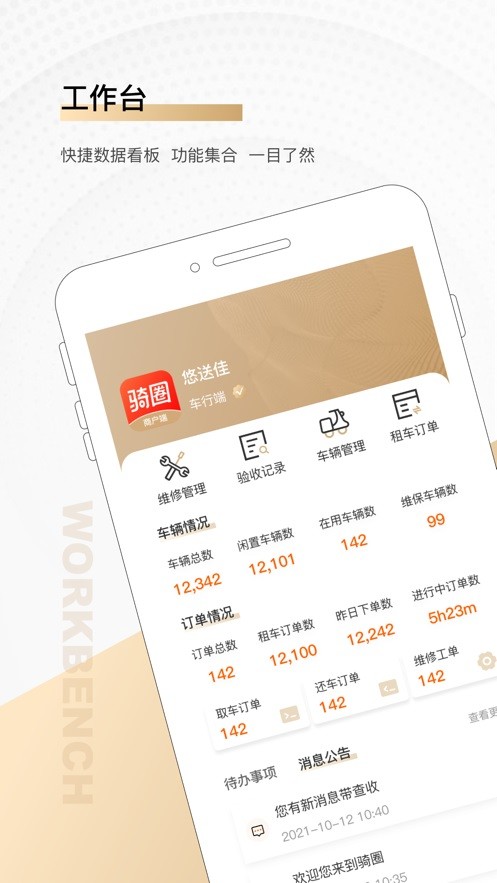 骑圈商户端app是为商户人员提供的管理软件,能够在手机上查看详细的车辆情况,闲置、在用以及维保的车辆数非常详细,支持查看租车订单以及验收记录,可以查看最新的系统公告信息,待办事项一目了然,处理更高效!