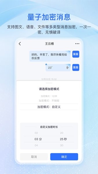 量子密信是一款由中国电信推出的手机办公软件,主打安全功能。它结合了量子加密技术和即时通讯技术,提供加密通话、消息传输、文件存储等多种功能,确保用户数据的高度安全性。软件整合了通讯、会议、审批、考勤等办公需求,所有操作和信息传输都经过加密处理。