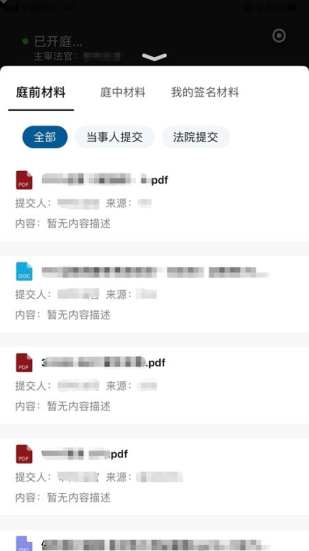在电子材料提交处,输入电子材料名称,上传电子材料,法官与当事人、诉讼参与人均可看到上传的电子材料。需要注意的是,应提前将电子材料存放于手机中,目前支持的文件格式包括:、文档、PDF 和音视频。查看电子材料的时候也需要选择手机中相应的应用程序来打开。