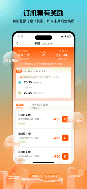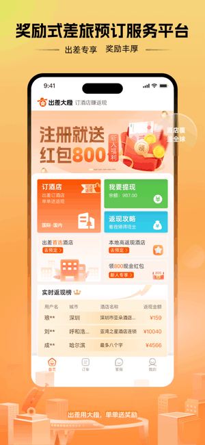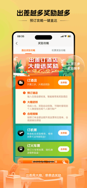 出差大橙是款非常适合出差人士的奖励式差旅预订平台,订机票、订酒店等成功后即可返现金给用户,且提供全额发票、行程单等报销凭证。