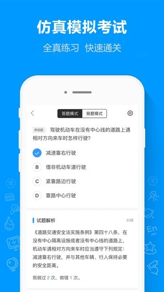 还有个亮点是交通图标速记,虽然刚开始学的时候觉得这些标志有点难记,但用这个软件练习了几次就容易多了。模拟考试的功能也很棒,让我在真实考试前能多次演练,心里更有底了。