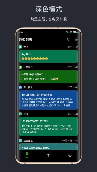 一条通知app是提供手机通知显示编辑管理的应用软件,体积小巧,界面布局设计简单,还具备强大的通知功能,支持多种模式通知,可以自定义设置,自由组合,实时记录通知详情,支持深色模式,操作简单易上手,轻松执行各种通知!
