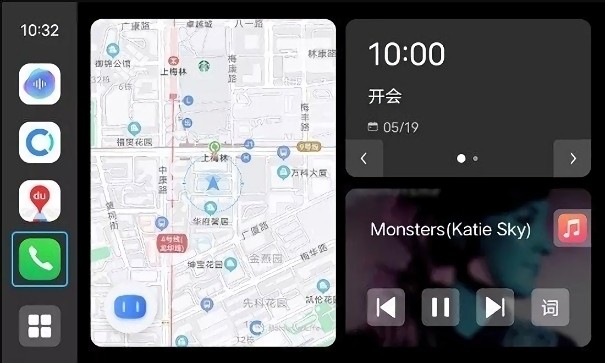 -- 在连接手机之后,手机会将虚拟屏幕投射到汽车中控屏幕上。最终呈现的界面与carplay类似,左侧显示应用入口,右侧分别显示导航、日程和音乐,更加高效。