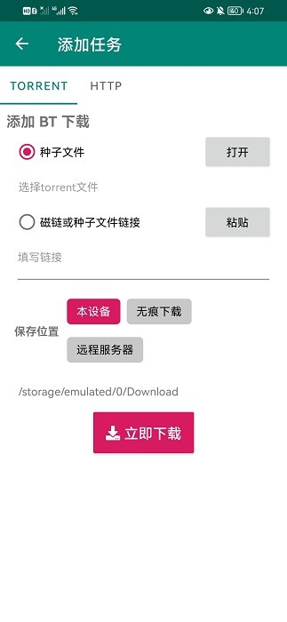 接着选择下载类型,比如磁力链接,贴入地址后,点击“立即下载”