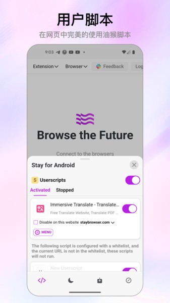 Stay浏览器拥有着最为强大的脚本管理功能, 支持油猴,暴力猴脚本。