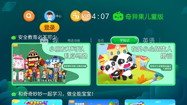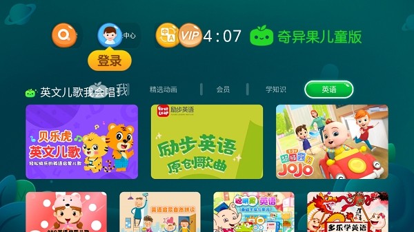 奇异果儿童版是银河、爱奇艺联合打造,针对0-12岁儿童量身设计的电视端视频观看软件。内容不仅涵盖了动画、儿歌、故事、电影等类型,更注重英语启蒙、知识学习等丰富有趣的教育内容。