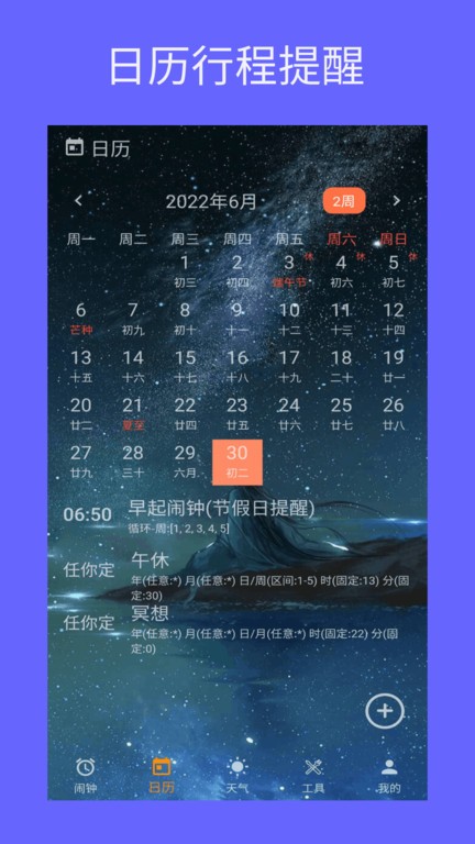 节假日智能提醒功能。如:法定节假日工作日闹铃自动跳过,前后周末调换按工作日闹铃自动提醒。再也不用担心忘记设置闹钟而迟到的问题了;
