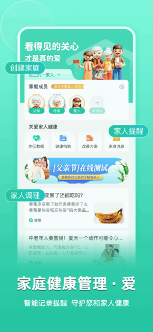 通过智能自检,为家人建立健康档案,创建家庭组,配合智能穿戴,随时查看家人健康状态,家人健康提醒、用药监督,让关心看得见。