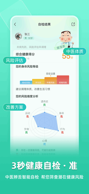 用相机拍摄舌面便可辨别体质,同时系统还会推送科学合理形式丰富的专属养生调理方案;