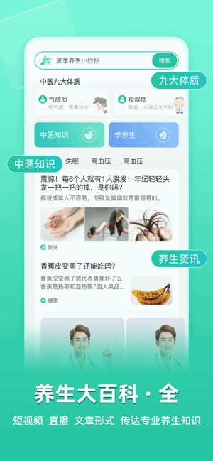 邀请中医养生领域行业专家、意见领袖、教授学者加盟,辅以养生知识内容策划,资讯图文、短视频等呈现形式多样化,传递更有价值的健康养生内容。