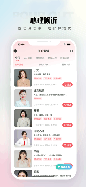 无需预约,即时倾诉,语音和文字多种倾诉选择,心里烦恼不过夜,解忧舒缓心情好;