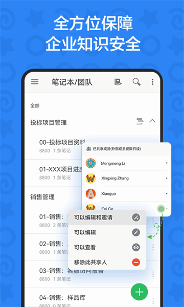 - 内容管理:笔记历史永久保留,误删一键恢复,保护知识资产离职文件永久保留,交接更轻松批量删除、更改标签、共享状态,管理更省心共享关系可查、可追溯、可修改,内部共享、对外共享状态一目了然。