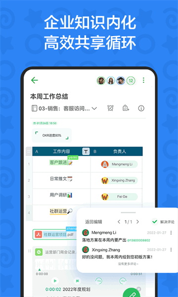 - 信息整合:笔记中支持各种格式,包括文字、表格、PDF、语音、视频、office文档、图片、网页便签,结构化呈现团队信息,业务结果一目了然。