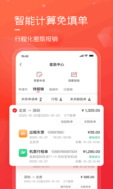 1、实现了智能报销模式,轻松计算,不用填单,可轻松实现行程旅差报销