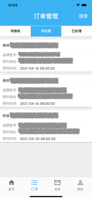 2、每一笔订单都有详细的介绍,在线查看订单内容,记录维修师傅的接单信息。