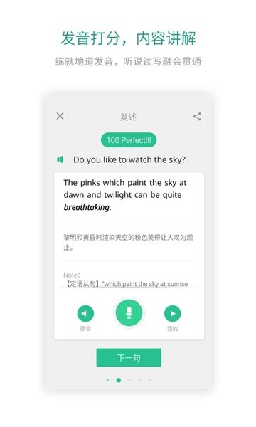 拒绝单一跟读模式,提供逐句中文翻译,让你听音复述。跟读模仿阶段还有智能打分,纠正你的发音错误,让你事半功倍。还可以将你的发音分享给朋友,学习路上不孤单~