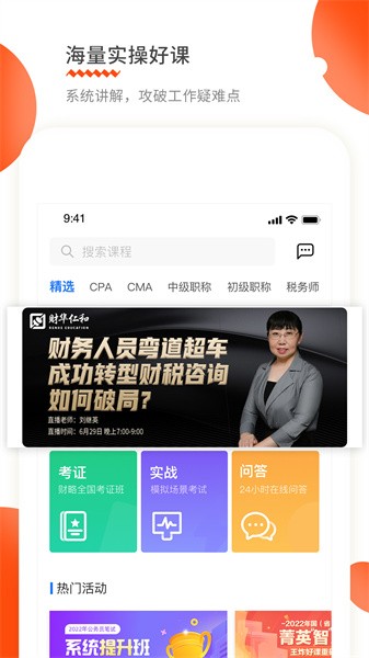 财华仁和会计app是一款专为会计学习打造的手机软件,隶属于武汉仁和会计。它提供了丰富的课程资源,包括初级、中级、高级CPA、CMA等考证课程以及实操培训。软件亮点很多,比如千余门精品课程随时学,名师直播答疑解惑,还有热点资讯助力考试准备。