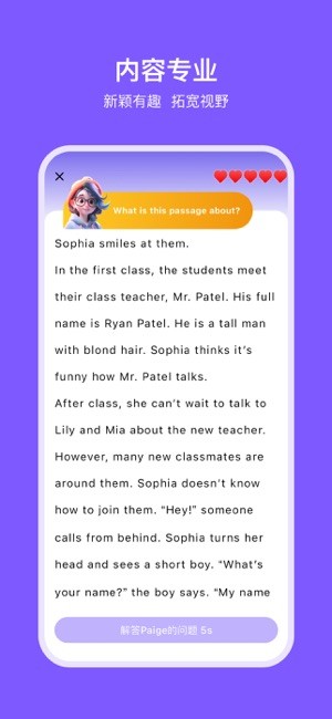 Paige采用可定制化的难度、生词、话题、长短、文体等形式,为孩子量身定制自己的阅读材料,紧贴新课标要求,题型丰富、覆盖兴趣&常考话题,能够全面锻炼学生的听、说、读、写、看等各项语言技能。