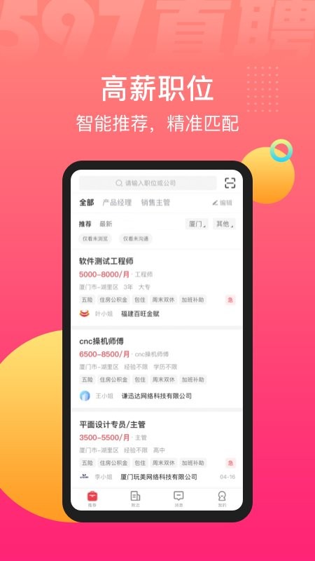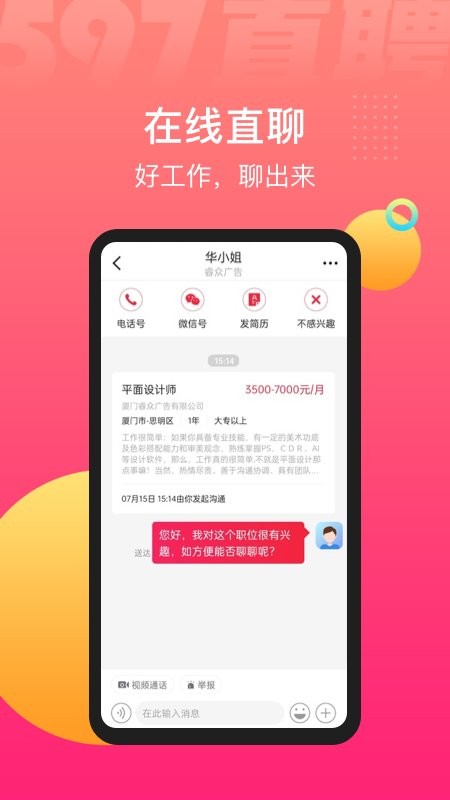 597直聘专注于在线求职招聘找工作,精准匹配招聘者和求职者,快速查看。随时随地,马上开聊。聊完就约,拍板快,入职快!全面海量的信息、职位让597成为100万+企业和2600万+求职者的共同选择。每天有数十万人在这里找到工作,不等待,不犹豫,下载后马上开聊!在线聊天面试,24小时极速入职!