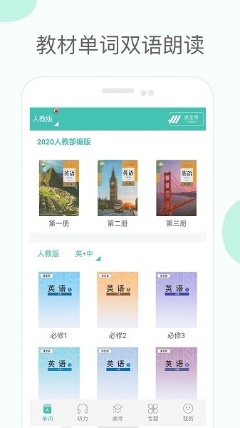 高中单词课堂,为高中生打造的单词学习aoo,提供单词的在线学习与背诵服务内容,在这里用户可以便捷寻找自己不会的教材单词内容,进行重点学习和背诵,软件提供生词本功能,不会的单词可以加入生词本随时复习,有需要的同学可以下载使用!