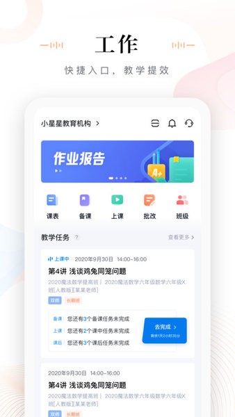 未来魔法校老师端是支持魔法校双师、AI和面授课堂的多功能教师移动端,满足面授老师以及辅导老师通过手机随时随地查看课表,备课、批改作业及查看班级课堂数据的需求,帮助合作机构及时掌握课中班级学习动态,更有针对性地实施课前课后教学服务。