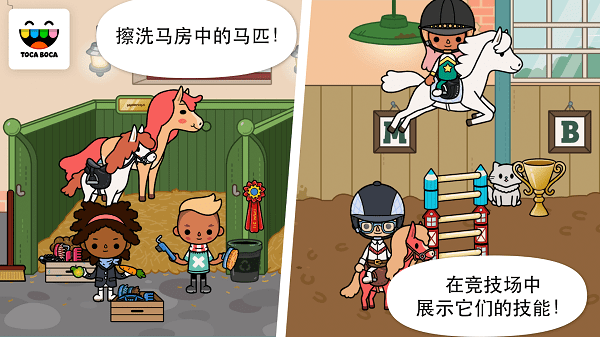 欢迎来到马儿与冒险的世界!给马梳毛洗澡,细心照顾它们,展示它们的雄姿!你可以参加中世纪马术格斗或狂野西部世界的角色扮演游戏。你还可以在浩瀚的星辰下骑上摩托狂飙和参加露营活动!在 Toca Life 中,你可以按照自己的方式游戏:马房!