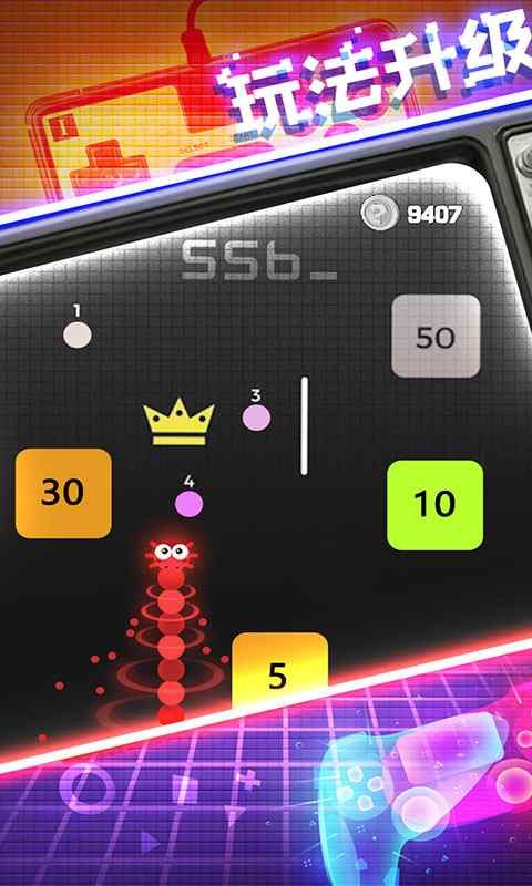 贪球蛇大战白块最新版有着绚丽多彩的界面设计,风格看上去十分清新,游戏将童年经典的贪吃蛇和打砖块玩法进行了结合,玩家需要操控这条蛇蛇不断吃点点,让自己变得更长之后就能去击碎带数字的砖块,数字大的记得等你变得更长再去撞击哦!
