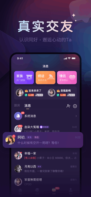 4、家族、师徒、情侣:加入家族,一起组队畅玩。拜师求徒,加深彼此关系。cpdd,你是唯一:遇见你的真爱,带着戒指,向Ta浪漫告白吧!
