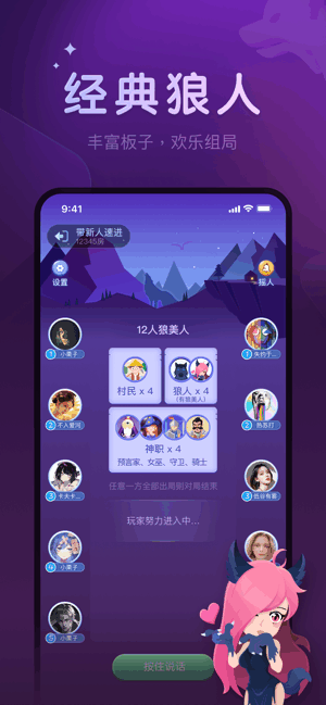 6人新手局、9人插麦局、9人标准局、10人上警局、12人守卫局、12人骑士局...随时开局,单人多人都可玩!
