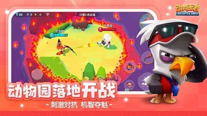 游戏里有传统的缩圈机制,安全区外会掉血,还得注意躲避火焰。战斗时可以利用地形埋伏,捡装备升级武器,这种即时竞技的感觉挺刺激的。而且还能和朋友一起组队玩,在皇家战场上抢武器、拼技术,最后成为动物园之王。
