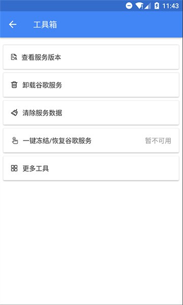 -- 支持一键禁用/启用谷歌服务功能,冻结谷歌服务后台功耗;