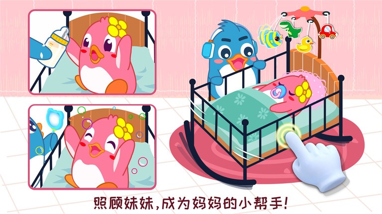 二胎时代,爸妈担心的也许是两个孩子的相处。游戏中让孩子角色扮演企鹅小福,做妈妈的小帮手,帮忙照顾妹妹,冲奶粉、摇摇篮等,感受照顾小宝宝的乐趣,树立起责任感。