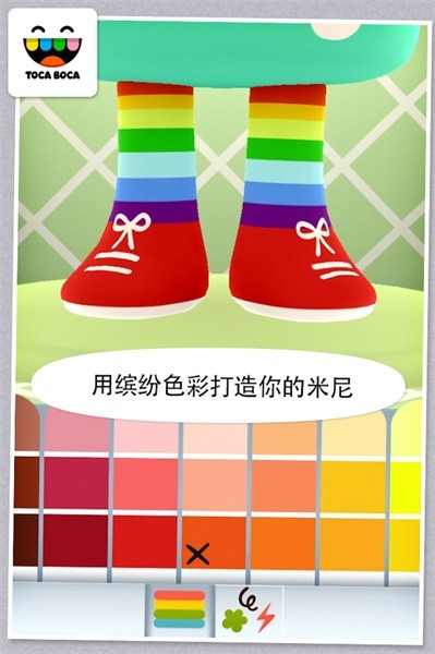 让我们开始吧,点击你的米尼来增添颜色、条纹、袖子还有裤子。发挥你的创造力来使用这些印章,他们可以帮助增添更多的细节,诸如帽子、袜子、花边和纽扣。增加面部特征可以让你的米尼微笑、打喷嚏和学会看世界!
