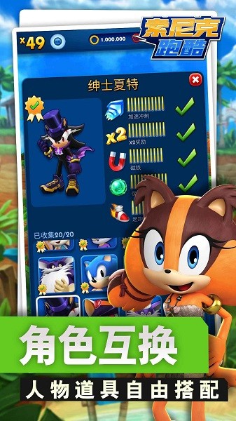 与索尼克共同奔跑,奖励越跑越多!解锁更多角色,如:塔尔斯、纳克鲁斯和夏特!与索尼克一同无尽跑酷,乐趣不分年龄!