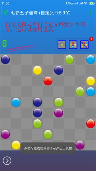 将相同颜色的彩球以横、竖、斜排成一条线,5个以上会自行消除并得分,如果移动时没有得分,将随机产生三个彩球,若空格被占满则游戏结束。