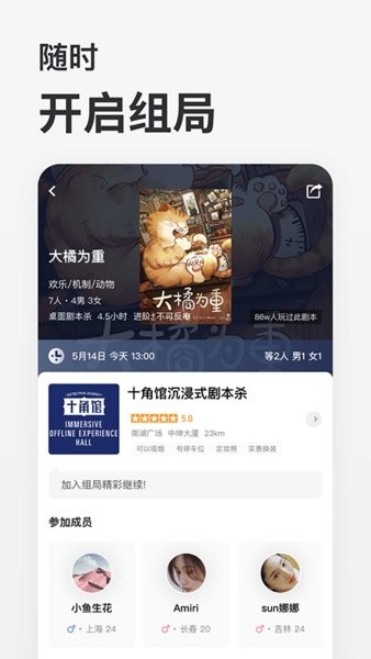 现有组局加入、选店选本约局、专属组局群聊,波吉更快满足你的玩本欲望,让素未谋面的你们更快成为朋友。