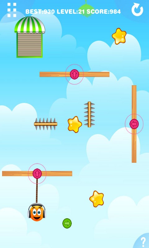 -- 碰到绿色或者红色的圆钮,它们会创建绳子挂住橙子。