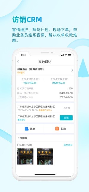 2、异常客户就要安排业务员及时沟通,把欠单欠款追回来,问题严重的就要线下拜访,拜访可打卡、拍照、写记录。老板可以像刷朋友圈一样监督外勤工作,了解一线客户情况。