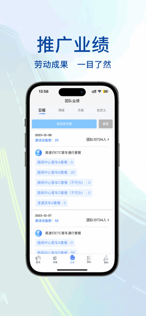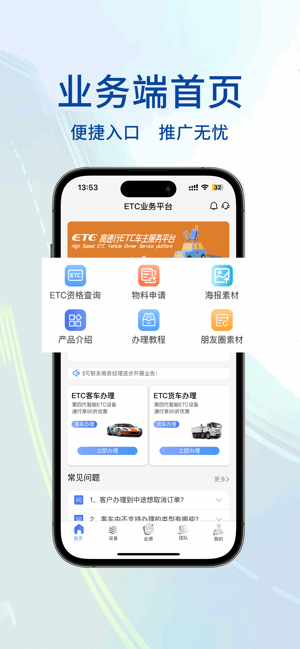 高速行业务端是提供etc业务办理管理服务的应用软件,集etc资格查询、物料申请、海报素材、产品介绍、办理教程、朋友圈素材等功能为一体,客车、货车业务办理更加方便,团队管理、设备管理更加高效,助力推广营销,业绩一目了然,操作简单!
