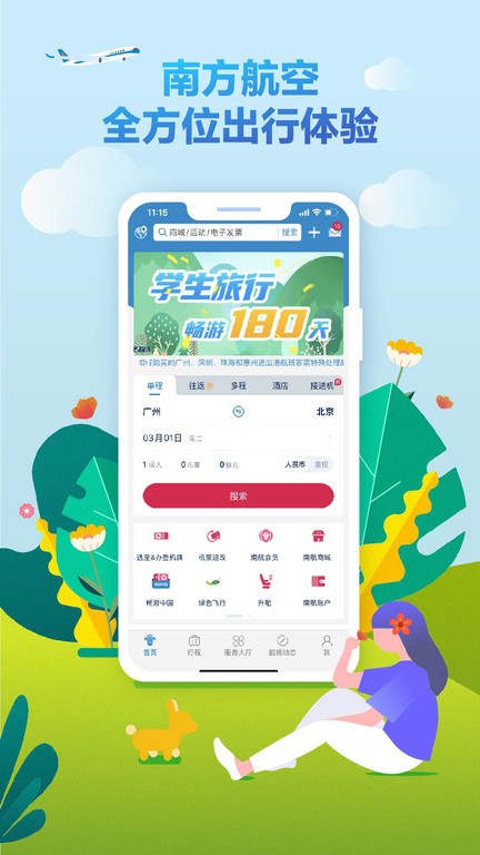 用户可以通过南方航空软件或关注南航官方微信公众号,在手机上轻松办理出行全流程的航空服务或便捷购买旅行产品。南航APP集旅行预订、出行服务、出行帮助于一体,满足用户出行全流程需求,贴心好用!