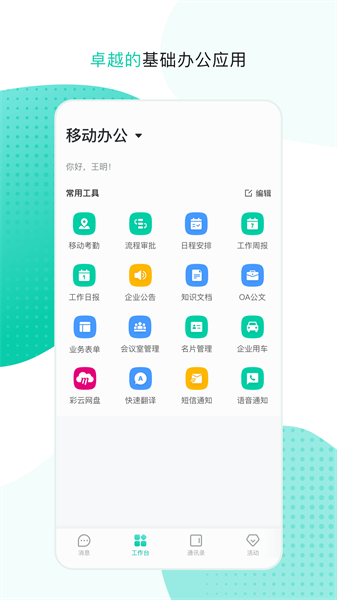 中国移动移动办公软件是中国移动为满足5G背景下一体化产品通信需求,全新打造的集5G通讯、基础办公及行业应用的一站式办公解决方案。