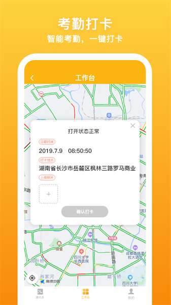 3、支持图片打卡,当自己进行上下班的打卡之后可以顺带上传自己上班与下班地方的图片;