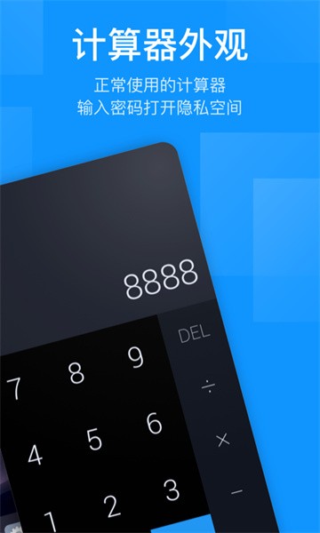 隐藏照片、视频、APP、联系人、音频、文档,【隐私盒子】是您贴心的手机隐藏助手!计算器安全外观,平时可以正常使用其计算功能,输入密码后,您将打开一个隐私空间,所有类型文件均可隐藏!
