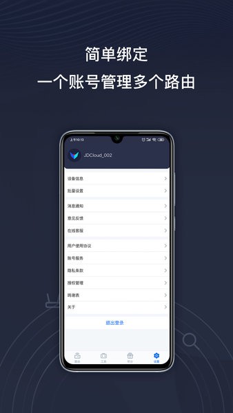 京东云无线宝app即为京东云路由器app,手机就可以轻松管理路由设备,支持一个账号绑定多个路由器,轻松管理每一个设备,商务状态随时查看;还可以对连接的设备进行控制,比如限制网速;可以一键踢出蹭网的用户。