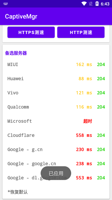 用于测试服务器地址栏和备选服务器列表中的地址速度和状态码,返回204为正常。有的服务器会通过空文件返回200的方法间接达到目的,但并非所有ROM都支持。