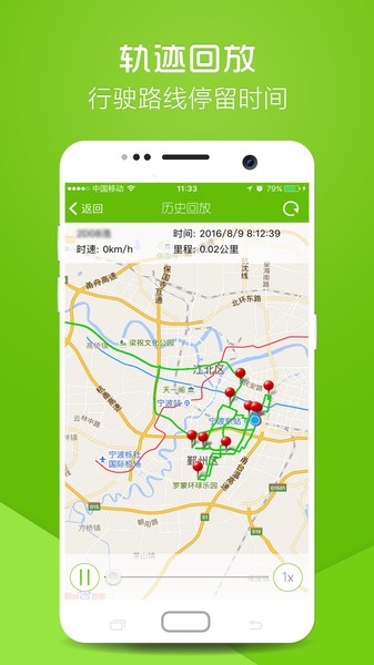 3、轨迹回放准确记录了行驶路线上的停留时间,信息展示详细;