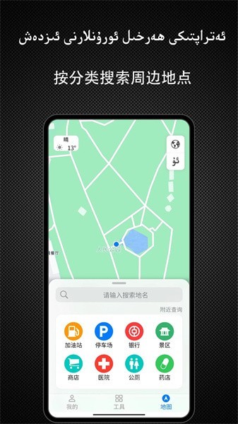 yolbaxlax app是一款支持中文和维吾尔文语言的地图导航出行软件,功能实用强大,满足出行需要。可以自由输入关键字搜索查询目的地,智能推荐导航路线,在线查看附近周边场景,包括加油站、停车场、银行、景区、商店、医院、公厕、药店等,十分方便!