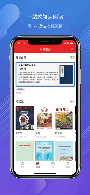 知识服务是目前客户端最强大的功能,设有阅览室和知识库等。阅览室有上千种名刊大刊的电子版,精品图书和音视频课程,还包括每日推荐的“人生必读图书”。