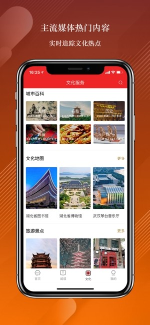 文化服务中“融媒中心”集中了本地和中央的电视、广播、报纸、主流新媒体。最大程度地方便居民接收新闻与文化娱乐信息。城市名片、城市百科、文化地图、旅行景点形成了深度的内容挖掘,梳理整合了武汉市的历史人文底蕴以及文化服务。