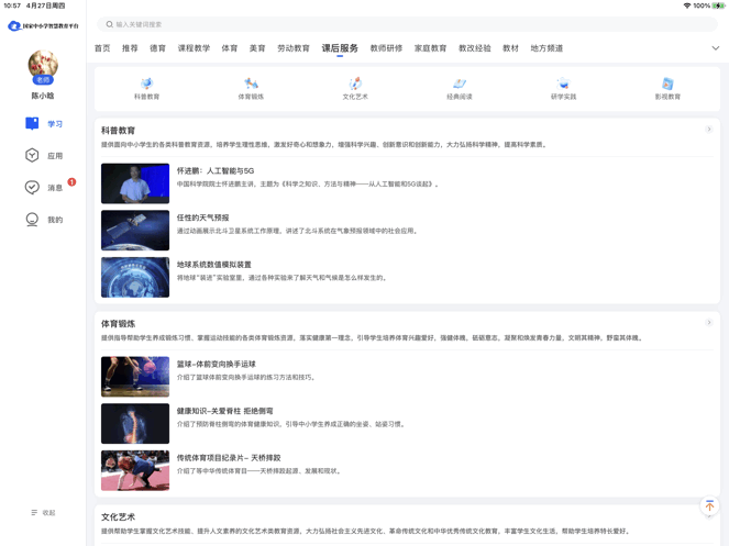 这款应用特色鲜明,包括专题教育、课程教学、教师研修、教改经验等多个板块。比如,在课程教学方面,有小学、初中和高中课程以及电子教材;在教师研修方面,则提供了思政师德、学科研修等多种资源。此外,平台还注重课后服务,如科普教育、体育锻炼等,丰富了学生的课外生活。